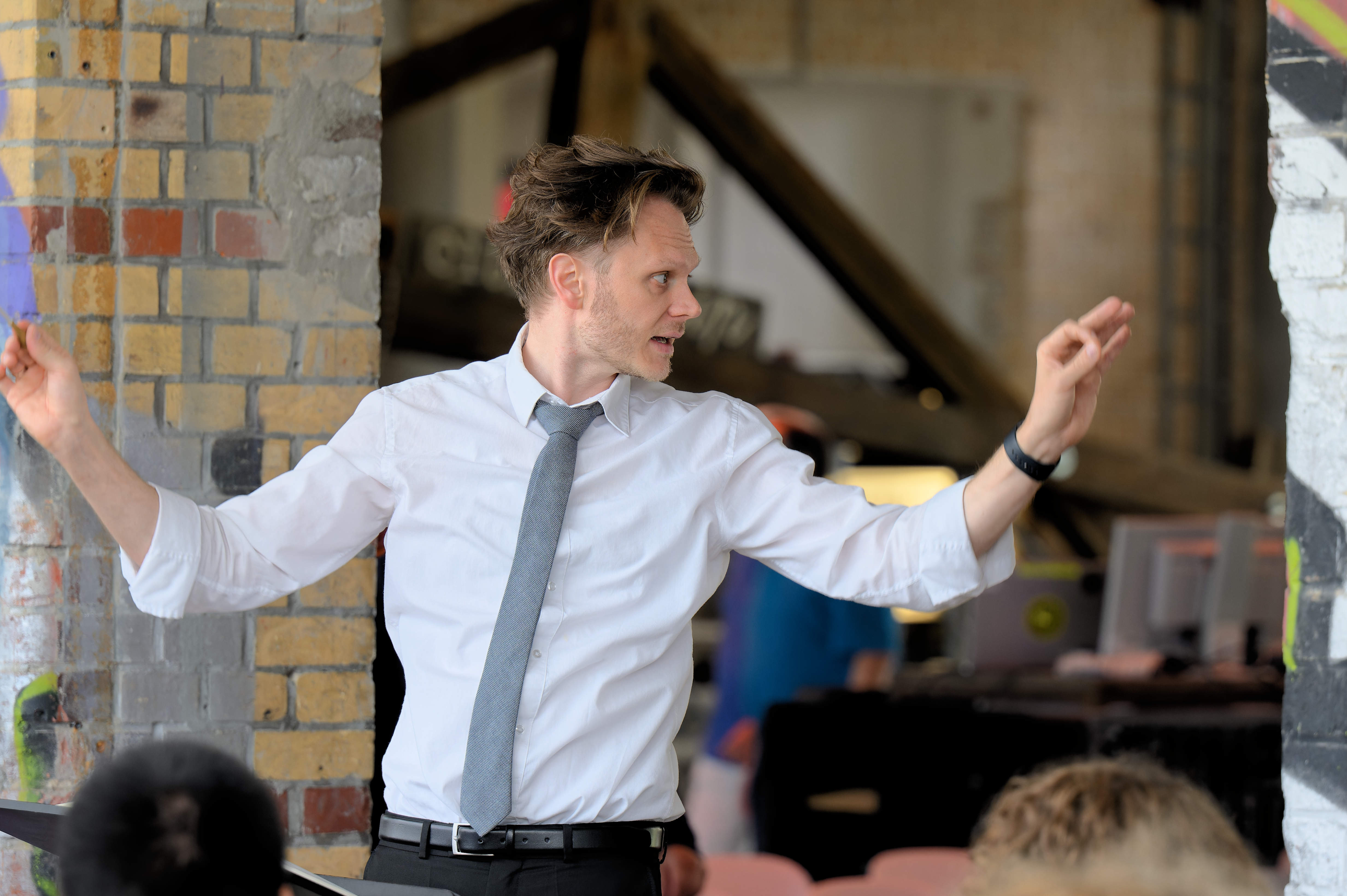 Dann hebt die Musik ab zum hymnischen Höhenflug. In die Orchesterwogen eingelassen wie ein Solo-Instrument ist eine Raumfahrt-Rede des US-Präsidenten John F. Kennedy von 1962, geradlinig rezitiert von Derrick Jenkins. Visionäre Worte, getragen vom heroisch aufwärtsstrebenden Orchester wie von Filmmusik, ein klangzelebrierter Menschheits-Augenblick. Bei der Uraufführung der knapp zehnminütigen Tondichtung am Samstag im Uni-Festsaal – Siegerstück des halbjährlich ausgeschriebenen Kompositionswettbewerbs der Studentenphilharmonie – dirigierte Straehler-Pohl selbst.